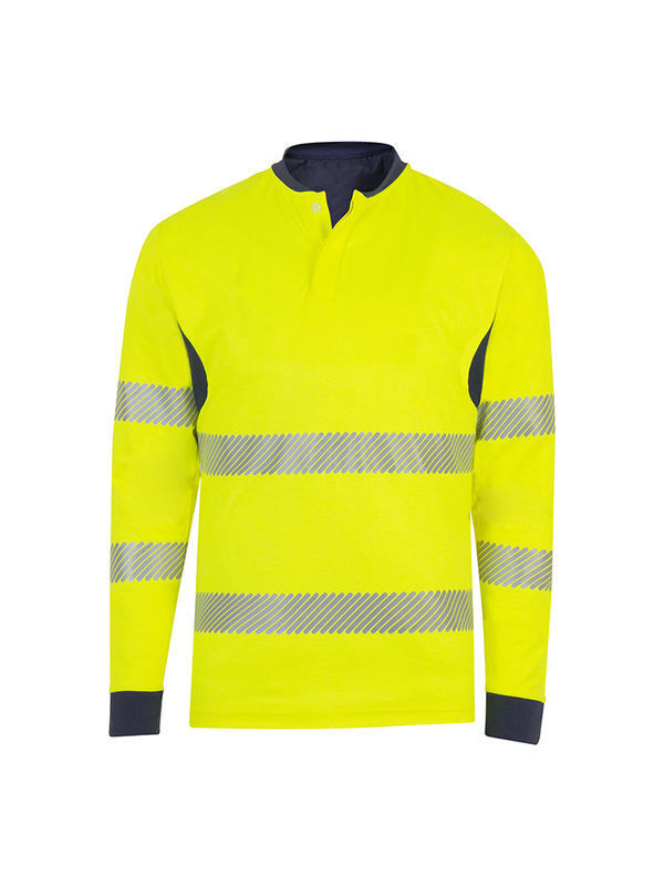 Polo haute visibilité maille double face ignifugée et antistatique. Col cycliste fermé par 2 boutons avec double patte, biais de propreté. Renforts d’épaules. Empiècement contrasté au dos du polo et sous bras. Manches longues, poignets contrastés. Dos protège-reins. Ourlet au bas du polo. 2 ceintures et 2 brassards rétroréfléchissants microbilles segmentés RETHIOTEX® de 5 cm thermocollés.