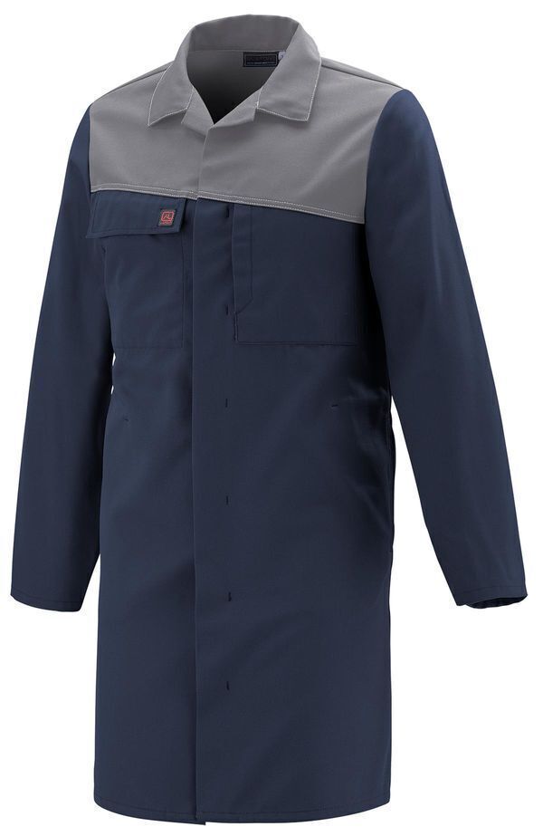 Blouse. Col transformable. Collerette de marquage. Empiècements devant et dos obliques. Devant fermé par pressions cachées. Manches montées. Poche poitrine droite incrustée sous rabat fermé par Velcro® cachés. Poche poitrine gauche avec ouverture verticale fermée par Velcro® caché. Poches basses insérées dans coutures côtés. Fonds de poches maintenus par point d’arrêt. Bas de manches réglables par pression. Fente dos. Mercerie tout plastique. Surpiqûres contrastées.