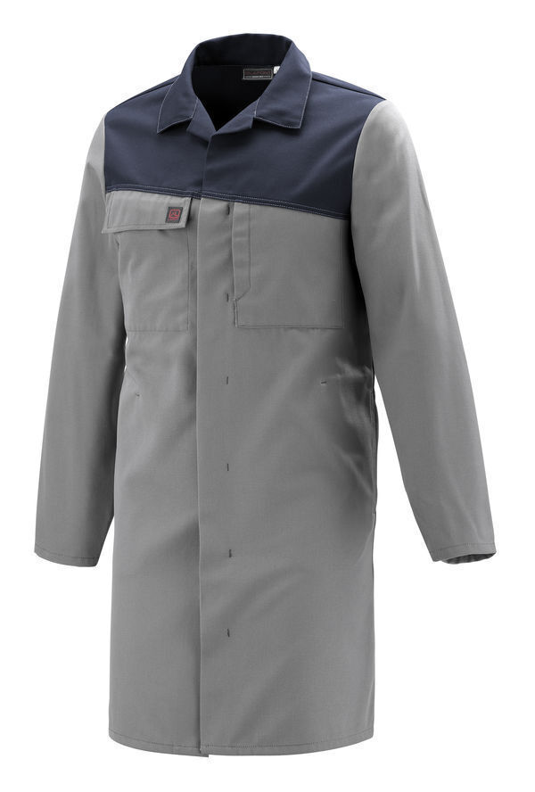 Blouse. Col transformable. Collerette de marquage. Empiècements devant et dos obliques. Devant fermé par pressions cachées. Manches montées. Poche poitrine droite incrustée sous rabat fermé par Velcro® cachés. Poche poitrine gauche avec ouverture verticale fermée par Velcro® caché. Poches basses insérées dans coutures côtés. Fonds de poches maintenus par point d’arrêt. Bas de manches réglables par pression. Fente dos. Mercerie tout plastique. Surpiqûres contrastées.