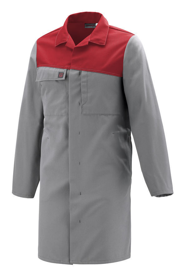 Blouse. Col transformable. Collerette de marquage. Empiècements devant et dos obliques. Devant fermé par pressions cachées. Manches montées. Poche poitrine droite incrustée sous rabat fermé par Velcro® cachés. Poche poitrine gauche avec ouverture verticale fermée par Velcro® caché. Poches basses insérées dans coutures côtés. Fonds de poches maintenus par point d’arrêt. Bas de manches réglables par pression. Fente dos. Mercerie tout plastique. Surpiqûres contrastées.