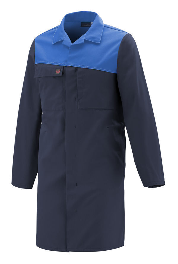 Blouse. Col transformable. Collerette de marquage. Empiècements devant et dos obliques. Devant fermé par pressions cachées. Manches montées. Poche poitrine droite incrustée sous rabat fermé par Velcro® cachés. Poche poitrine gauche avec ouverture verticale fermée par Velcro® caché. Poches basses insérées dans coutures côtés. Fonds de poches maintenus par point d’arrêt. Bas de manches réglables par pression. Fente dos. Mercerie tout plastique. Surpiqûres contrastées.