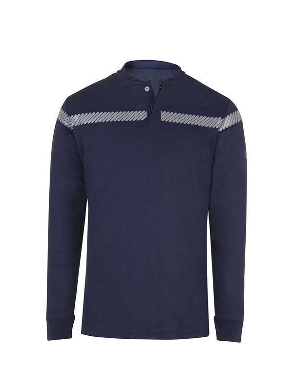 Polo maille double face ignifugé et antistatique. Col cycliste fermé par deux boutons avec double patte. Biais de propreté à l’encolure. Renforts d’épaules. Dos protège-reins. Patte de marquage. Ourlet au bas du polo. Bande rétroréfléchissante microbilles segmentée RETHIOTEX® 26 500-01 de 3 cm thermocollée.
