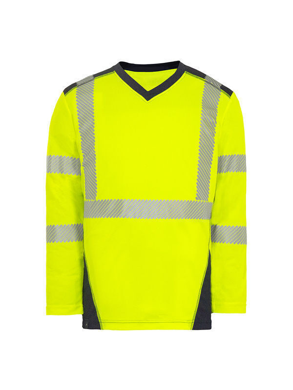 T-shirt haute visibilité coupe cintrée. Col V contrasté. Manches longues. Empiècement maille ajourée contrasté sous les bras. | Bandes rétroréfléchissantes segmentées microbilles thermocollées. Maille polyester transfert d’humidité et anti UV UPF 40+. Coupe cintrée.
