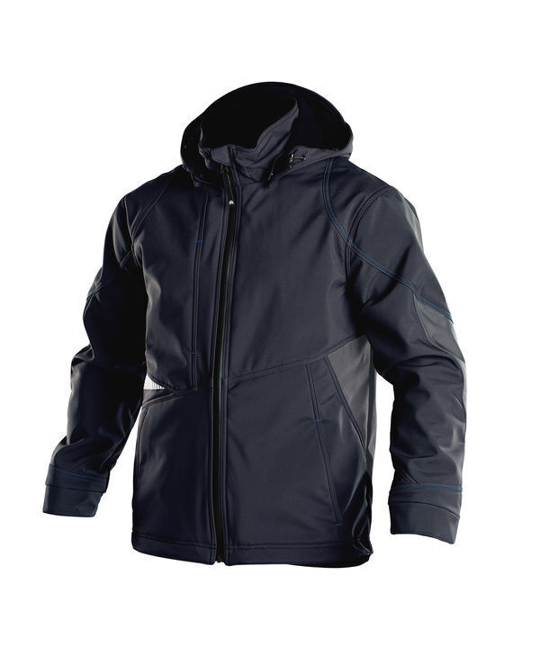 Softshell 3 couches doublée polaire. Capuche amovible et réglable avec cordon élastique. Col montant. Fermeture centrale à glissière YKK® avec protège-menton. Poche poitrine pour téléphone avec passant pour écouteur. 2 poches plaquées zippées. 2 poches intérieures zippées. Poignets coupe-vent en tricot. Renforts coudes Cordura®. Bas de veste réglable avec cordon élastique. Dos rallongé. | Doubles surpiqûres contrastées. Détails rétroréfléchissants. Imperméabilité et respirabilité : 5000/5000