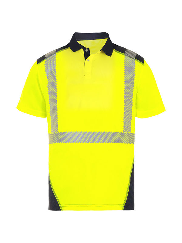 Polo haute visibilité. Col en bord-côte fermé par 2 boutons, avec une bande de propreté. Manches courtes ourlées. Maille ajourée sous les bras. Empiècements contrastés épaules et bas du polo. | Bandes rétroréfléchissantes microbilles segmentées RETHIOTEX® thermocollées. Coupe cintrée.
