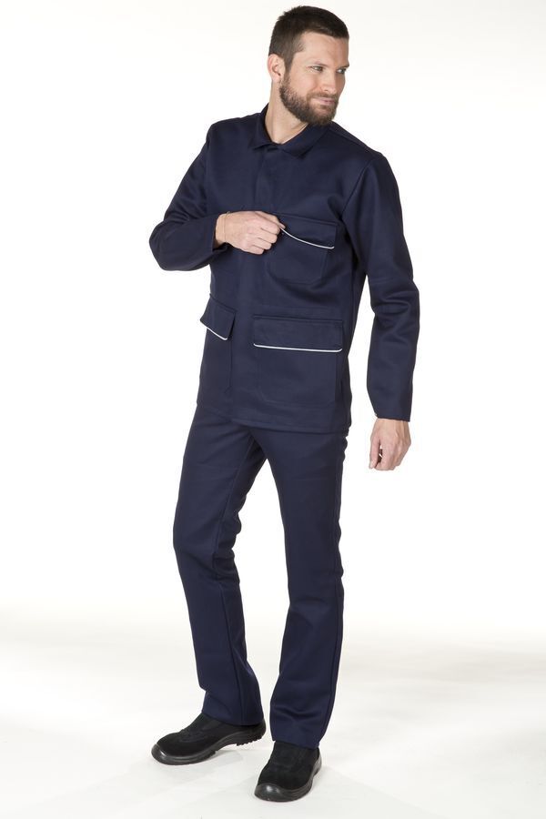 Pantalon ceinture élastiquée côtés fermée par bouton. Braguette fermée par zip. 2 poches italiennes ouvertures invisibles. Poche arrière à rabat fermée par bouton-pression. Renfort intérieur tissu plaqué sur devant cuisse. | Traitement ignifuge. E.J. : 82 cm.