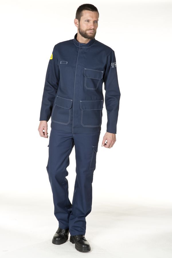 Veste col montant. Fermeture 7 boutons-pression cachés. Bas de manches avec soufflets réglables par pressions. 1 passant pour détecteur sur la poitrine. 2 poches basses dans les coutures avec rabat, 1 poche poitrine intérieure fermée par auto-agrippant, 1 poche poitrine à rabat avec boutons-pression cachés. Ceinture élastiquée côtés. Mercerie tout plastique. Montage fil para-aramide.