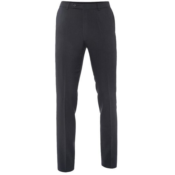 Pantalon homme. Ceinture 5 passants fermée par 1 bouton et 1 crochet, braguette à glissière. Poches italiennes, 2 poches dos fermées par bouton. Coupe droite. E.J. : 90 cm.