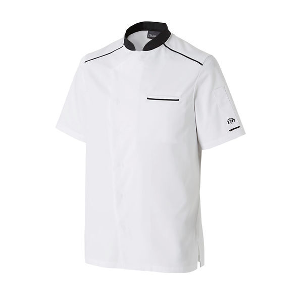 Veste homme col officier contrasté. Fermeture devant par 7 pressions cachées. 1 poche poitrine passepoilée. Empiècements épaules. Soufflet dos en maille respirante. Fentes côtés. Manches courtes. 1 poche stylo plaquée sur manche gauche. Empiècements sous bras en maille respirante. Passepoil contrastant : empiècements épaules devant et dos, bas de poche stylo, poche poitrine passepoilée.
