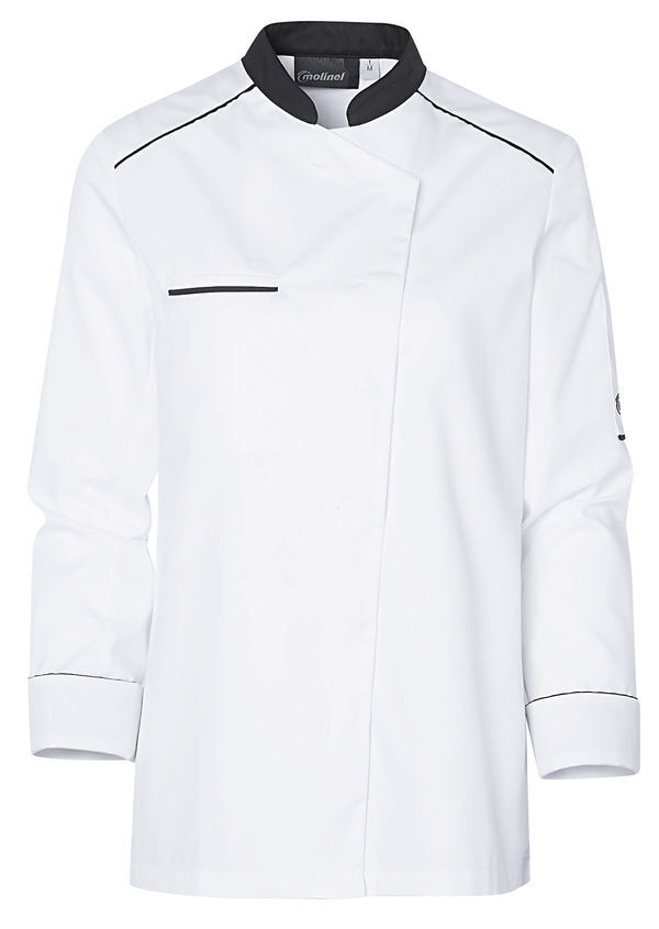 Veste femme à col officier contrasté. Fermeture devant asymétrique par pressions cachées. Poche poitrine passepoilée. Manches longues, poignets rapportés. Poche stylo plaquée sur manche gauche. Fentes côtés. Empiècements sous bras et dos en maille respirante. Passepoil contrasté aux épaules devant et dos, bas de poche stylo. Coupe regular. Maille double face alvéolée antibactérienne.