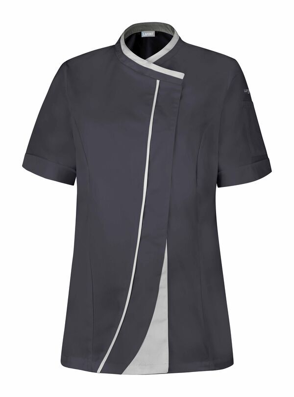 Veste femme à effet double col. Fermeture croisée par grippers cachés, double empiècement milieu dont angle bas contrasté et biais contrasté sur toute la hauteur. Découpes princesse sur devant et dos. Fentes côtés renforcées par un twill jacquard. OEillets d'aération brodés sous bras. Manches courtes. Bas de manches à revers. Coupe ajustée.