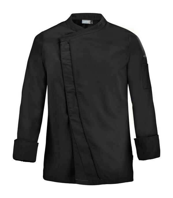 Veste homme à effet double col. Fermeture croisée par grippers cachés, double empiècement milieu dont angle bas contrasté et biais contrasté sur toute la hauteur. Fentes côtés renforcées par un twill jacquard. Oeillets d'aération brodés sous bras. Manches longues, poignets rapportés avec détails contrastés. Bas de manches à revers.