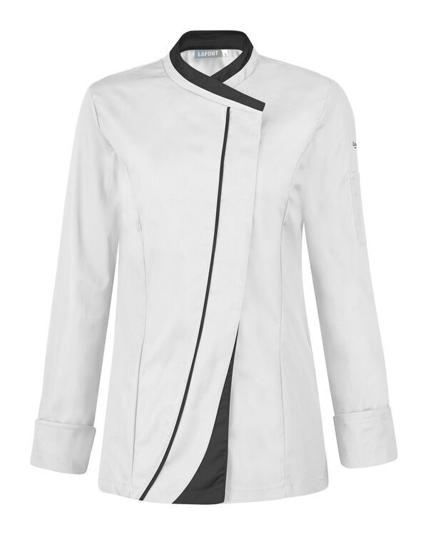 Veste femme à effet double col. Fermeture croisée par grippers cachés, double empiècement milieu dont angle bas contrasté et biais contrasté sur toute la hauteur. Découpes princesse sur devant et dos. Fentes côtés renforcées par un twill jacquard. OEillets d'aération brodés sous bras. Manches longues, poignets rapportés avec détails contrastés. Bas de manches à revers. Coupe ajustée.