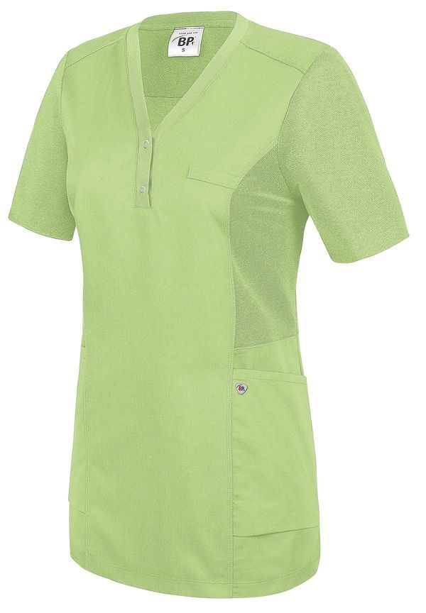 Tunique bi-matière à enfiler coupe femme. Encolure en V avec patte de boutonnage 2 boutons-pression. Empiècements en piqué extensibles sous les aisselles, 2 grandes poches latérales dont 1 avec poche pour bip, passant pour badge. Coupe ajustée. Manches courtes. Longueur : 68 cm.