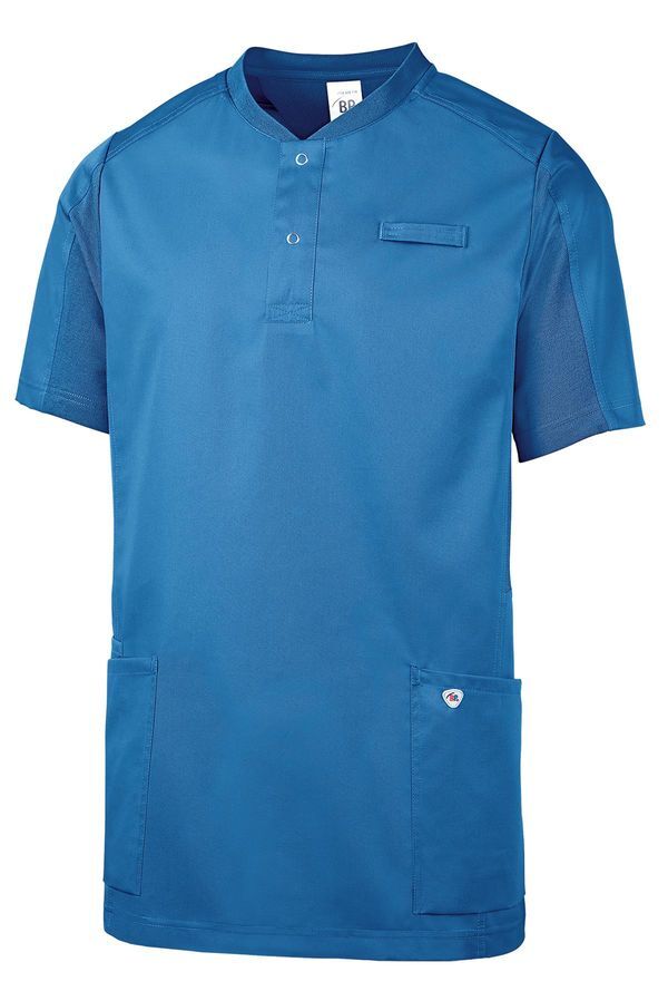 Tunique bi-matière à enfiler mixte. Encolure en V avec patte de boutonnage 2 boutons-pression. Empiècements en piqué extensibles sous les aisselles, 2 grandes poches latérales dont 1 avec poche pour bip, passant pour badge. Manches courtes. Longueur : 76 cm.