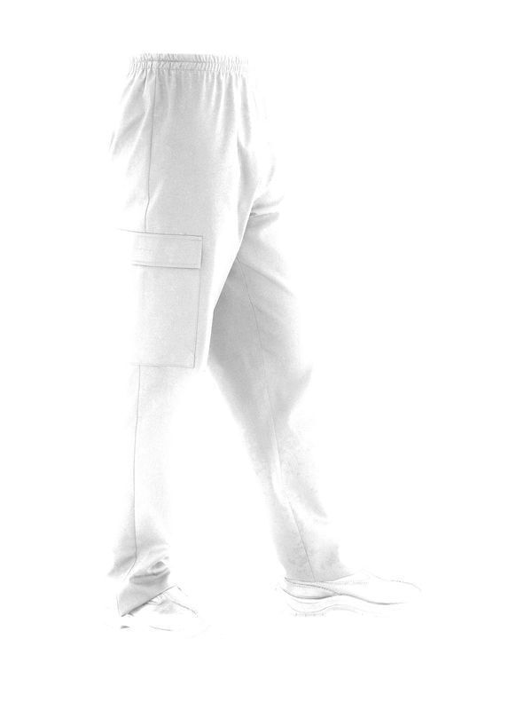 Pantalon homme. Ceinture élastiquée, braguette zip. 1 poche BIP cuisse gauche, 1 poche à soufflet avec rabat cuisse droite. E.J. : 82 cm.