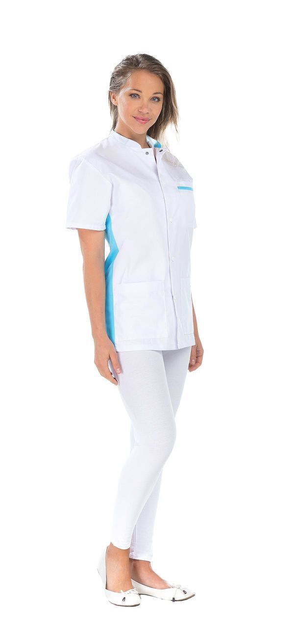 Tunique mixte. Fermeture milieu devant par boutons-pression. 2 poches basses. 1 poche BIP dans la poche gauche. Poche poitrine passepoilée. 1 poche stylo sur manche gauche. Manches courtes. Maille côtés, dos des manches et intérieur du col. Fentes dos. Longueur : 75 cm.