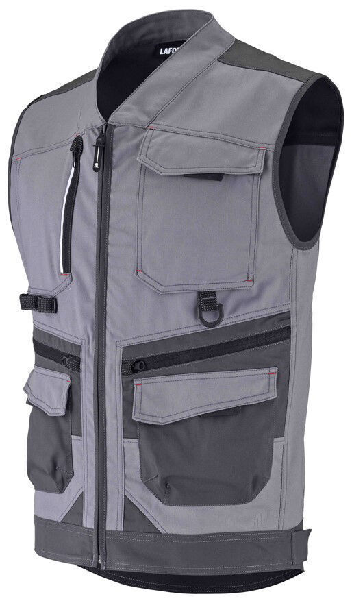 Gilet multipoches, col en V. 2 poches poitrine : droite fermé par zip verticale, détail rétroréfléchissant; gauche plaquée sous rabat fermé par pressions cachées. 2 double poches basses superposées. Empiècement dos contrasté. Découpes côtés. Ceinture droite avec patte de serrage côté fermé par pressions. Dos rallongé.
