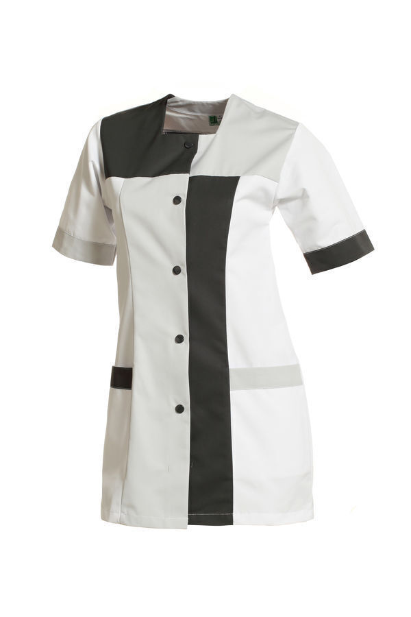 Tunique femme. Encolure carrée. Fermeture milieu devant par 5 boutons-pression contrastés. Jeux d'empiècements colorés sur le devant. 2 poches basses. Manches courtes montées à parement contrastant. Longueur : 80 cm.