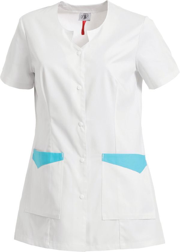 Tunique coupe femme. Encolure fantaisie. Pinces devant et dos. Fermeture devant par pressions plastiques. 2 poches basses, soufflets bas de poche et parements contrastés. Manches courtes. Fentes côtés. Longueur : 76 cm.