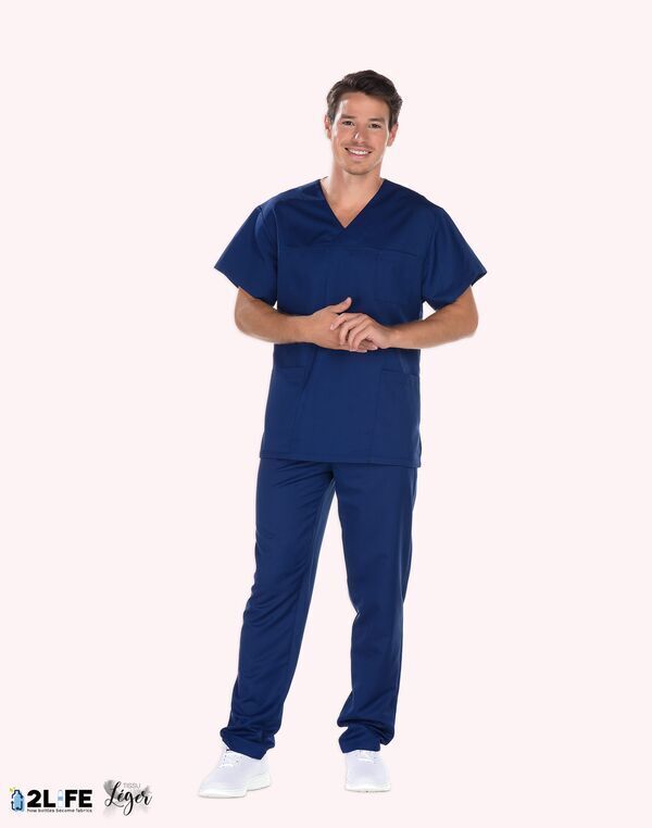 Tunique mixte encolure V. Poche poitrine, 2 poches basses. Fentes côtés. Manches courtes. Longueur : 75 cm.