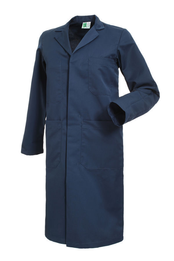 Blouse homme. Col tailleur. Fermeture milieu devant par boutons-pression sous patte. Poche poitrine. 2 poches basses. Manches longues. Longueur : 100 cm.