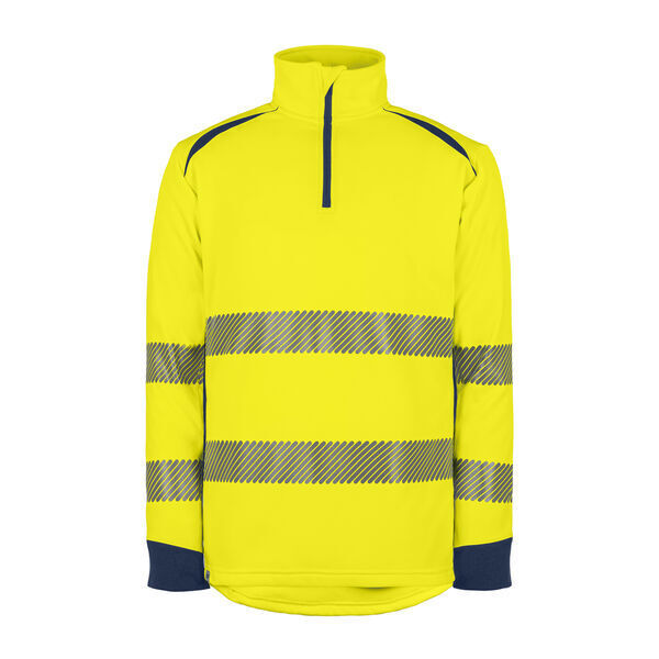 Sweat-shirt certifié GRS. Col camionneur avec protège menton au niveau du zip. Manches longues, poignets en maille Cordura®. Renforts Cordura® coudes, poignets, épaules. Dos protège-reins. | Coupe ajustée. Bandes rétroréfléchissantes microbilles RETHIOTEX® segmentées thermocollées.