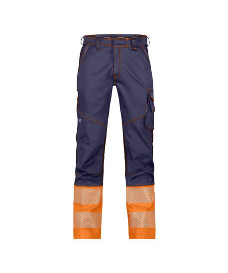 Pantalon stretch classe 1. Ceinture fermeture à glissière et bouton jeans caché, réglable au dos par élastique. 6 passants. 2 poches italiennes. Poche cuisse. Porte-crayon, poche mètre, poche cutter, poche téléphone et boucle pour porte-badge. Poches arrière plaquées dont 1 avec rabat. Poche de sécurité cachée avec fermeture à glissière. Coutures triples. Bandes réfléchissantes segmentées de 80 mm. Coupe ajustée.