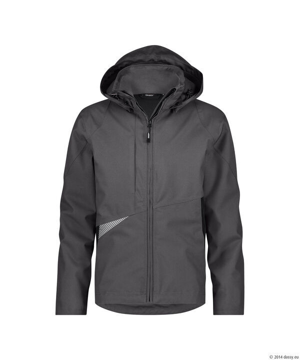 Veste imperméable et coupe vent, doublure mesh 3D. Fermeture zippée centrale avec protège menton. Capuche amovible serrage élastiquée. 2 poches basses et poitrine zippées, poche téléphone et poche intérieure. Poignets réglables avec auto-agrippant et coupe-vent. Bas de veste réglable par cordon élastique de serrage. Dos rallongé. Détails réfléchissants. Coutures doubles et thermocollées.