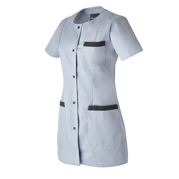 Tunique femme. Encolure ronde. Fermeture milieu par 5 bouton-pression apparents. Manches courtes montées. Fentes côtés. 1 poche poitrine sur devant gauche avec parement contrasté. 2 poches basses avec parements contrastés. Découpes bretelles devant et pinces dos. Longueur : 80 cm.
