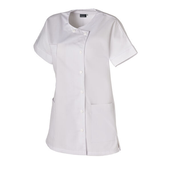 Tunique femme. Encolure ronde. Fermeture asymétrique par bouton-pression calotés blanc. 1 poche poitrine. 2 poches basses. Parement ton sur ton aux manches et aux 3 poches. Manches courtes. Fentes côtés. Longueur : 75 cm.
