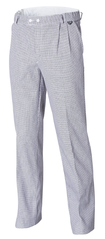 Ceinture élastiquée, plis devant 2 poches devant en biais,1 poche passepoilée arrière, braguette à boutons.